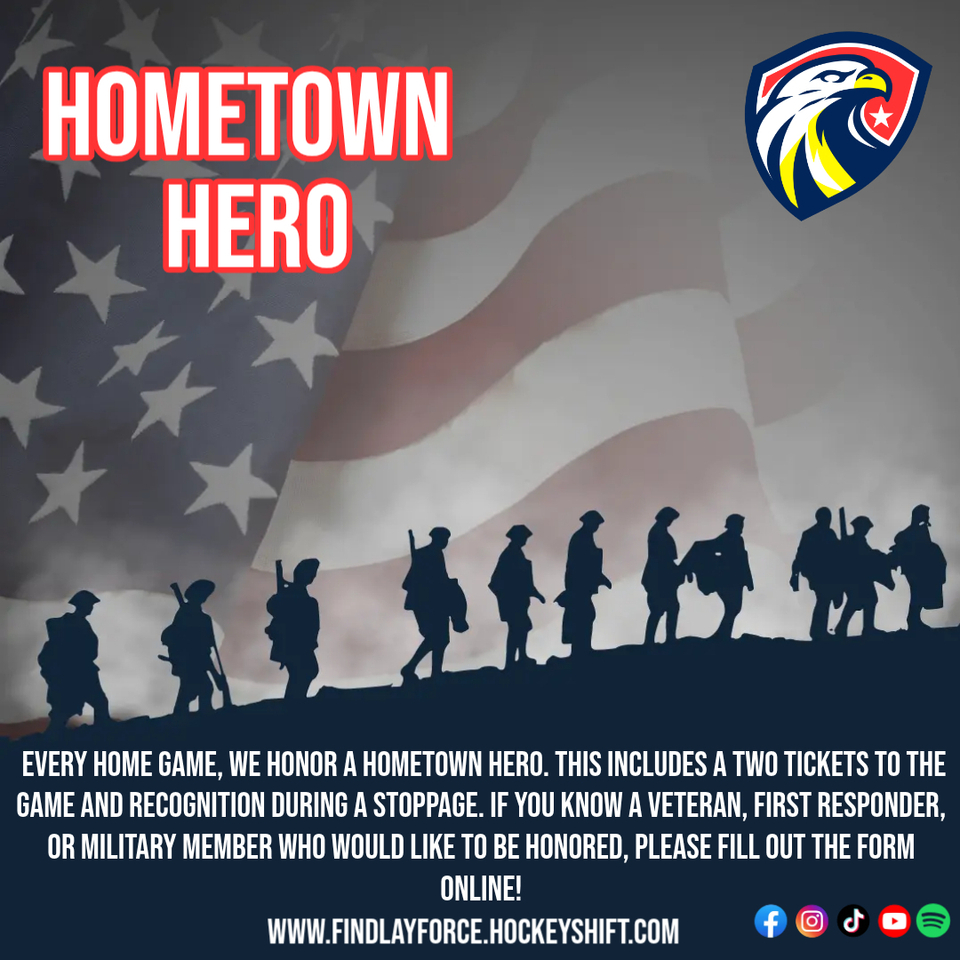 Hometown HeroEVERY HOME GAME, WE HONOR A HOMETOWN HERO. THIS INCLUDES two TICKETs TO THE GAME AND RECOGNITION DURING A STOPPAGE. IF YOU KNOW A VETERAN, FIRST RESPONDER, OR MILITARY MEMBER WHO WOULD LIKE TO BE HONORED, PLEASE FILL OUT THE FORM BELOW.